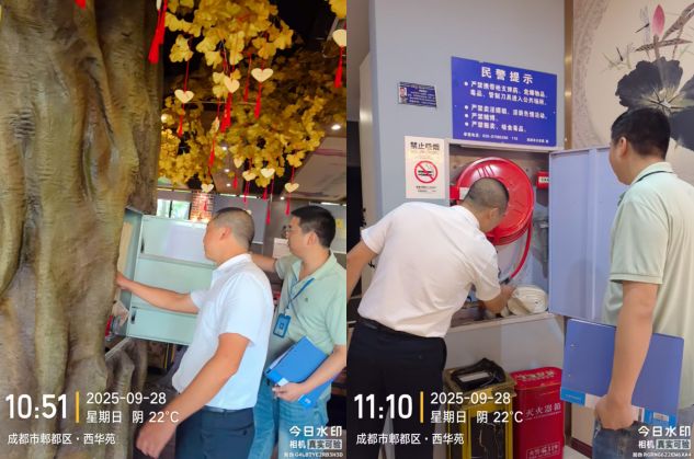 庆双节.护平安—安全守护伴你行,为全面排查整治各类安全隐患,及时防范化解各类安全风险,切实筑牢安全防线,确保“国庆双节”期间安全稳定。资产公司结合工作实际于2025年9月28日与西华苑物业方一起对公司管辖范围内商铺及公共区域进行了一次全面安全检查,对检查中发现的消防、用电等安全隐患及时制止和纠正,并要求商家立即进行现场整改。在检查的同时也对商家日常经营过程中遇到的安全问题进行了指导。